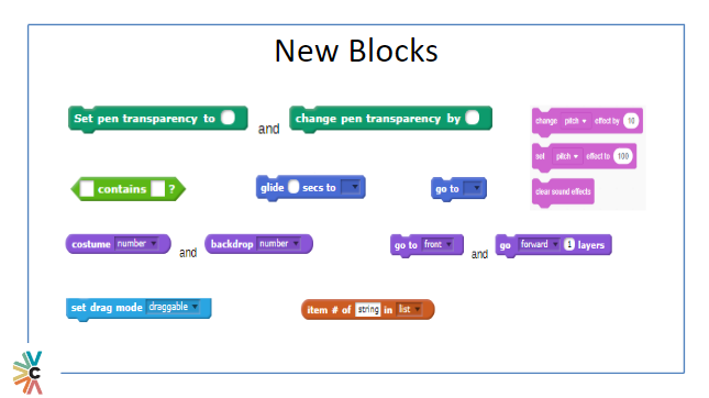 The addition of new blocks enables more interactive and more in-depth programming. New blocks include “item # of [string] in [list]”, “[blank] contains [blank]?”, and “go to [front]”. These additions create a myriad of new ways for blocks to interact with each other.