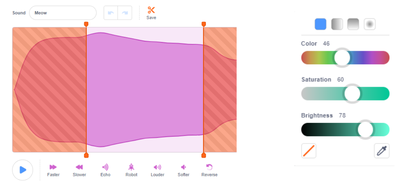 Scratch 3.0 brings new sound editing and color selection tools that gives you the ability to make your programs truly unique. Now you have more control over audio – trim it down or add sound effects! Additionally, the color selector used in sprite editing and pen color selection gives you the ability to more accurately choose the saturation and brightness of colors.