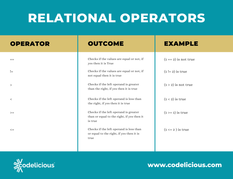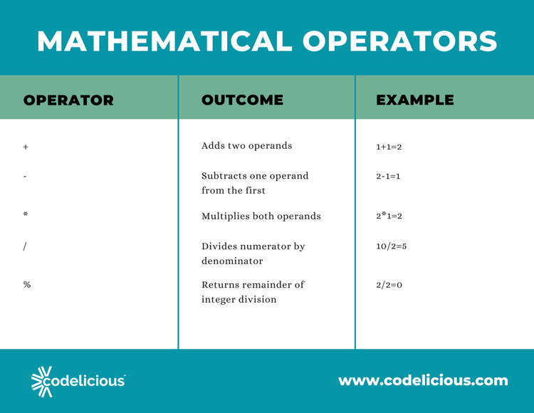 In programming languages, an operator is a symbol that tells code to perform certain operations to produce a final result. Operators will always be a symbol (or a group of symbols) that is mathematical, logical, or relational in nature. Even in programming, the order of operations still matters because they tell a computer what next steps to take. Learn more about specific types of operators in the charts below: