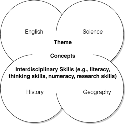 Interdisciplinary integration organizes different school subjects (like English, science, math, and social studies) around foundational skills for students (like the four C’s of 21st century learners). The idea is that all the lessons from the core subjects reinforce a common theme, while also aligning with educational standards. Here is an example from ASCD: