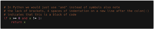 Another significant design decision for Python’s syntax was the use of whitespace as a way to organize control flow blocks, something that was borrowed from Python’s predecessor, ABC. This is different from other languages that use keywords or punctuation.