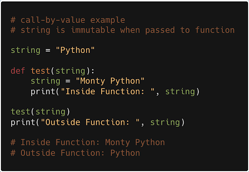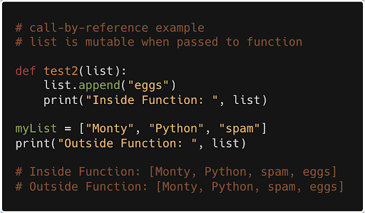 Since Python is a dynamically typed language, Python’s values – not variables – contain the type information, which has many impacts on the way the language functions. All variables contain references to objects, and these references are what is passed to functions. With some exceptions, a function cannot change the value of variable references when the function is called. This scheme to pass parameters around is referred to as “call-by-object reference” or “call-by-assignment”. Which is a system used within Python in the event an argument passed to a function is a string, integer or whole number, the passing is like call-by-value because you cannot change the value of the immutable objects passed to the function. Whereas passing a mutable object, like a list, to a function is considered call-by-reference because when the value is changed inside a function, it is also reflected outside of the function.