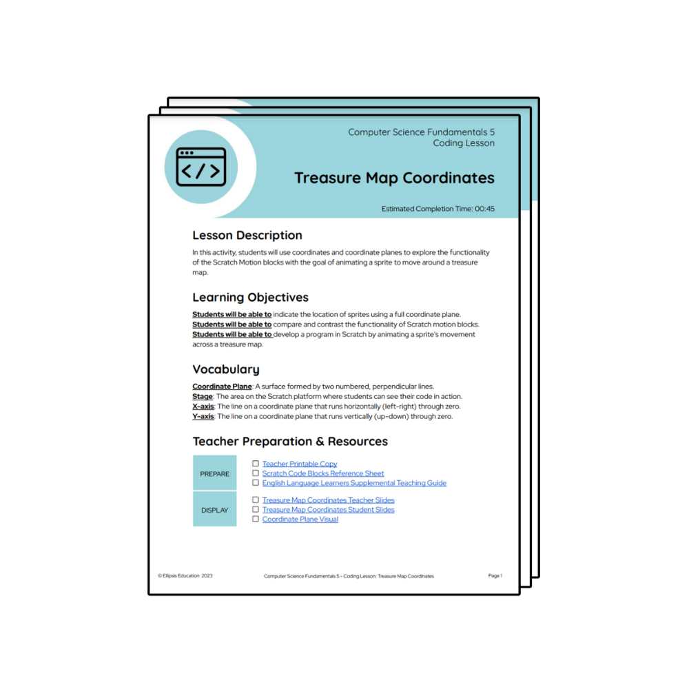 In Treasure Map Coordinates, students will code a sprite to move across a treasure map using the coordinate plane.