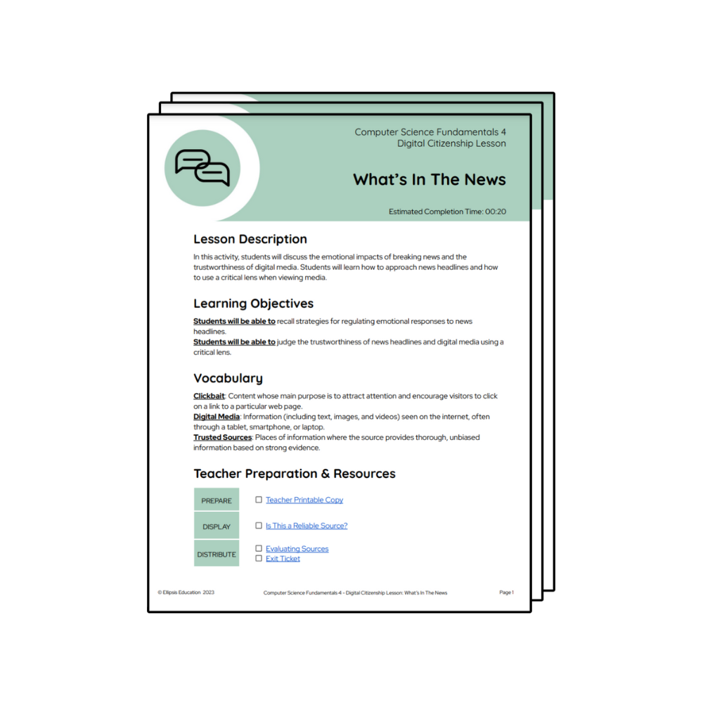 In What’s in the News, students will discuss breaking news and the trustworthiness of digital media.
