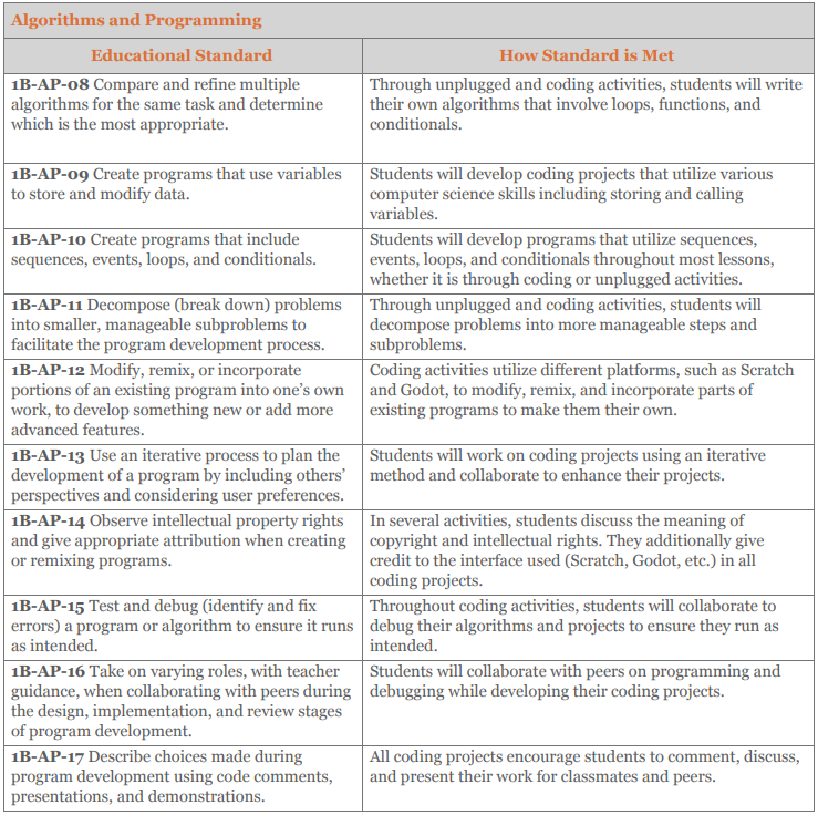 The CSTA standards are a nationally recognized set of computer science standards developed by the Computer Science Teachers Association. They aim to provide an age appropriate, rigorous, and accessible foundation for schools and districts looking to implement computer science in K-12. To ensure the standards were practical for all teachers, administrators and stakeholders, a task force of educators revised the CSTA K-12 computer science standards in 2017. The standards have been adopted or adapted by many states; see if your state has implemented the CSTA computer science standards by visiting our United States K-12 Computer Science Standards page. All Ellipsis courses align with the CSTA computer science standards.
