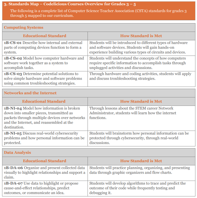 Each course, regardless of programming language or grade band, comes with a standards alignment map customized to the standards chosen by your school or district. Below, preview an example standards map. This particular document is an overview of how our 3-5 and 6-8 courses crosswalk with the CSTA standards.