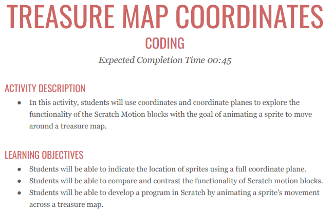 In this activity, students will use coordinates and coordinate planes to explore the functionality of the Scratch Motion blocks with the goal of animating a sprite to move around a treasure map. This lesson is built for grades 3 – 5 and introduces coding for kids: Scratch, a block based coding language.