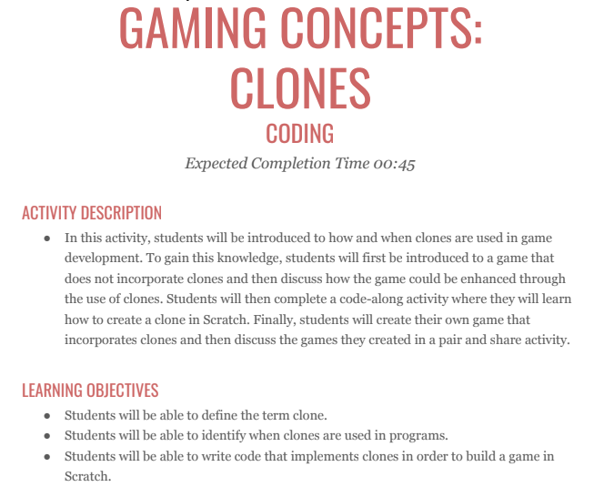 In the lesson Gaming Concepts: Clones, students will be introduced to how and when clones are used in game development. To gain this knowledge, students will first be introduced to a game that does not incorporate clones and then discuss how the game could be enhanced through the use of clones. Students will then complete a code-along activity where they will learn how to create a clone in Scratch. Finally, students will create their own game that incorporates clones and then discuss the games they created in a pair and share activity. The lesson aligns with computer standards and includes links to the appropriate materials and resources, a detailed procedure, activity tips, and a bonus challenge activity.