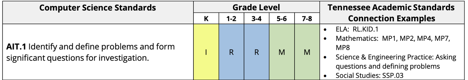 Each grade level has standards that fall within these concepts. The concepts are built upon throughout each grade and are meant to be integrated into other academic areas. For example, look at the image below from the Tennessee computer science standards. You can see the grade level progression as well as connections to other TN state standards and Tennessee Common Core standards such as Math and ELA standards.